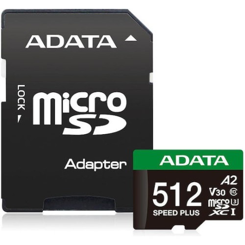 Adata microSDXC 512GB Class 10 U3 V30 A2 με αντάπτορα (UD512GUI3V30A2SP-RA1)