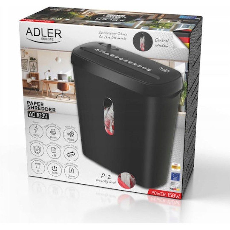 Τα προϊόντα που δεν αναγράφουν διαθέσιμο σημαίνει ότι δεν υπάρχουν άμεσα διαθέσιμα στο κατάστημα και θα παραληφθούν το αργότερο εντός των εργάσιμων ημερών που αναγράφεται στη διαθεσιμότητα. Σε κάθε περίπτωση η ημερομηνία μπορεί να μεταβληθεί και θα υπάρχει σχετική ενημέρωσή σας.Η Adler AD 1039 είναι ένας συμπαγής καταστροφέας εγγράφων, ιδανικός για χρήση σε σπίτι ή μικρό γραφείο. Προσφέρει βασικό επίπεδο ασφάλειας (P-2), κατάλληλο για την καταστροφή προσωπικών ή επαγγελματικών εγγράφων, κόβοντας έως 6 φύλλα Α4 ταυτόχρονα σε λωρίδες πλάτους 6 mm. Διαθέτει αυτόματη λειτουργία start/stop, λειτουργία reverse για αποφυγή εμπλοκών και προστασία υπερφόρτωσης, ενώ λειτουργεί σχετικά αθόρυβα (περίπου 70 dB). Ο κάδος απορριμμάτων έχει χωρητικότητα 8 λίτρων, κάνοντάς τον πρακτικό για καθημερινή χρήση χωρίς συχνό άδειασμα. Συνολικά, πρόκειται για μια οικονομική και αξιόπιστη λύση για βασική καταστροφή εγγράφων, με απλή λειτουργία και συμπαγή σχεδίαση.