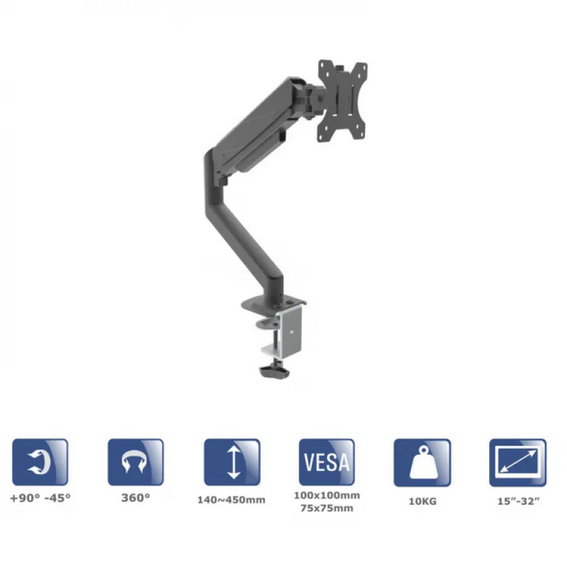 Ο βραχίονας οθόνης Akyga AK-MB-05 της Akyga είναι μια σύγχρονη και εργονομική βάση γραφείου με μηχανισμό gas spring, που επιτρέπει εύκολη και ακριβή ρύθμιση της θέσης της οθόνης. Υποστηρίζει οθόνες 15 έως 32 ιντσών με μέγιστο βάρος έως 10 kg και είναι συμβατή με πρότυπα VESA 75×75 και 100×100 mm. Προσφέρει μεγάλη ευελιξία κινήσεων με περιστροφή 360°, κλίση από +90° έως −45° και λειτουργία PIVOT για εναλλαγή από οριζόντια σε κάθετη προβολή. Η ανθεκτική κατασκευή και το ενσωματωμένο σύστημα διαχείρισης καλωδίων βοηθούν στη διατήρηση ενός τακτοποιημένου και επαγγελματικού χώρου εργασίας, ενώ η επιτραπέζια εγκατάσταση εξασφαλίζει σταθερότητα και άνεση στη χρήση.