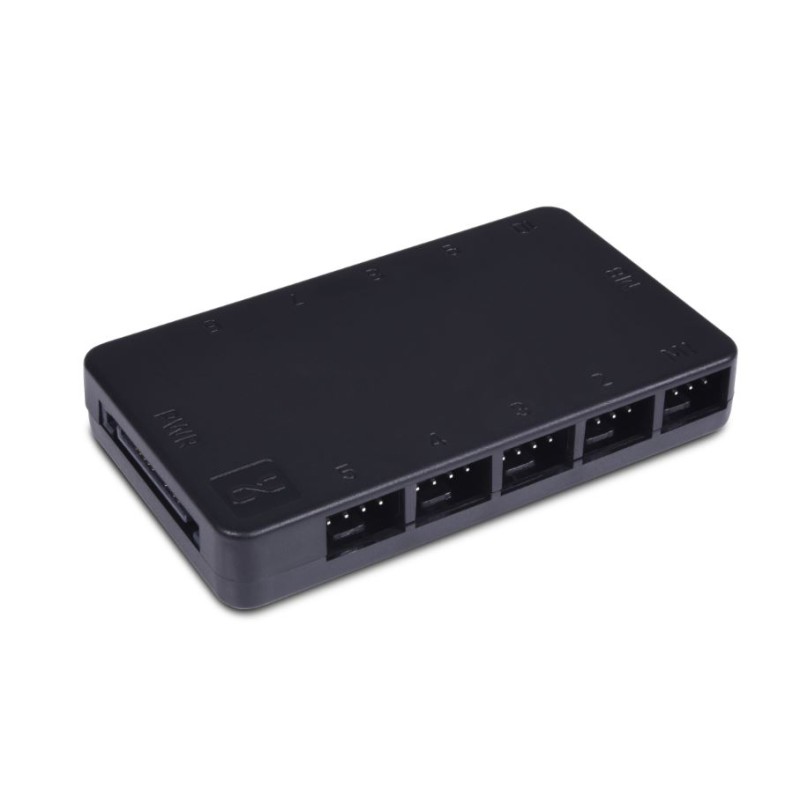 Το Alphacool Core Splitter προσφέρει τη δυνατότητα να ελέγχετε έως και δέκα ανεμιστήρες ταυτόχρονα χρησιμοποιώντας την κύρια πλακέτα μέσω PWM. Χάρη στο συμπαγές του σχεδιασμό, μπορεί να χρησιμοποιηθεί ακόμα και στους πιο περιορισμένους χώρους και επιτρέπει συντονισμένη διαχείριση καλωδίων. Συνδέεται απευθείας στην κύρια πλακέτα μέσω ενός συνδέσμου 4 ακίδων (MB) χρησιμοποιώντας το καλώδιο προσαρμογέα που παρέχεται. Τροφοδοτείται με ρεύμα χρησιμοποιώντας ένα βύσμα SATA της τροφοδοσίας του Η/Υ (θύρα PWR). Στη συνέχεια, ο πρώτος ανεμιστήρας συνδέεται στην κύρια θύρα. Η ταχύτητα θα διαβαστεί από αυτόν τον ανεμιστήρα στο μέλλον. Μπορεί να συνδεθούν έως και 10 ανεμιστήρες με συνολική κατανάλωση ισχύος 54W (4.5A). Η ταχύτητα όλων των ανεμιστήρων θα ελέγχεται από τον κύριο ανεμιστήρα.