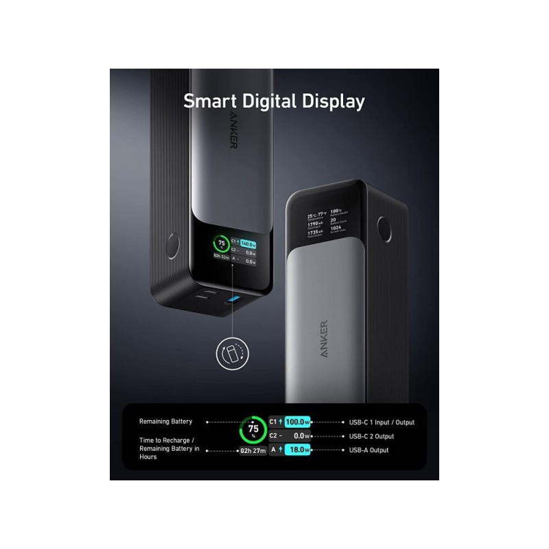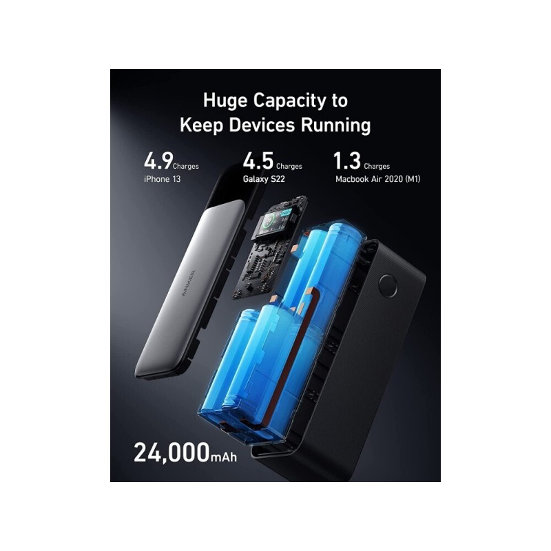Το power bank της Anker έχει χωρητικότητα 24000mAh που μπορεί να προσφέρει τουλάχιστον 4 φορτίσεις σε ένα συνηθισμένο κινητό τηλέφωνο. Διαθέτει μία θύρα USB-A και μία θύρα USB-C, Η τεχνολογία γρήγορης φόρτισης Power Delivery του επιτρέπει να φορτίσει τις συσκευές σας (εφόσον υποστηρίζουν και αυτές την αντίστοιχη τεχνολογία) σε μικρότερο χρόνο.