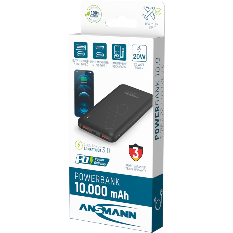 Τα προϊόντα που δεν αναγράφουν διαθέσιμο σημαίνει ότι δεν υπάρχουν άμεσα διαθέσιμα στο κατάστημα και θα παραληφθούν το αργότερο εντός των εργάσιμων ημερών που αναγράφεται στη διαθεσιμότητα. Σε κάθε περίπτωση η ημερομηνία μπορεί να μεταβληθεί και θα υπάρχει σχετική ενημέρωσή σας.Το power bank της Ansmann έχει χωρητικότητα 10000mAh που μπορεί να προσφέρει περίπου 2 φορτίσεις σε ένα συνηθισμένο κινητό τηλέφωνο. Διαθέτει 2 θύρες USB-A και μία θύρα USB-C, Οι τεχνολογίες γρήγορης φόρτισης Power Delivery και Quick Charge 3.0 του επιτρέπουν να φορτίσει τις συσκευές σας (εφόσον υποστηρίζουν και αυτές την αντίστοιχη τεχνολογία) σε μικρότερο χρόνο.