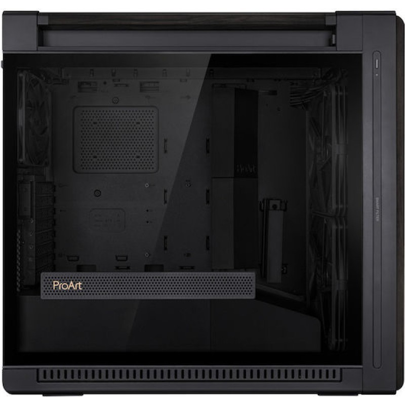 ProArt PA602 E-ATX με υποστήριξη radiator 420 mm, έναν προεγκατεστημένο ανεμιστήρα 140 mm και δύο 200 mm, ένδειξη επιπέδου σκόνης στην πρόσοψη.