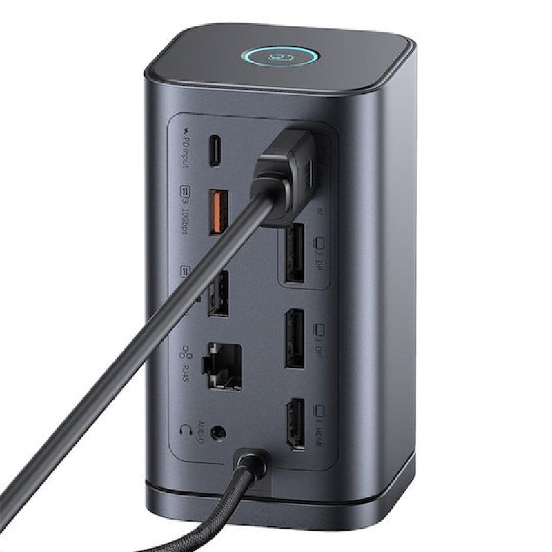 Τα προϊόντα που δεν αναγράφουν διαθέσιμο σημαίνει ότι δεν υπάρχουν άμεσα διαθέσιμα στο κατάστημα και θα παραληφθούν το αργότερο εντός των εργάσιμων ημερών που αναγράφεται στη διαθεσιμότητα. Σε κάθε περίπτωση η ημερομηνία μπορεί να μεταβληθεί και θα υπάρχει σχετική ενημέρωσή σας.Το Baseus Spacemate 11-in-1 Docking Station είναι ένας πλήρως εξοπλισμένος σταθμός σύνδεσης που μετατρέπει μία θύρα USB-C σε ένα ολοκληρωμένο κέντρο επέκτασης για επαγγελματική χρήση. Προσφέρει 11 διαφορετικές θύρες, μεταξύ των οποίων 2 HDMI και 2 DisplayPort για σύνδεση έως και τριών οθονών (σε Windows), USB-C και USB-A με ταχύτητες έως 10Gbps, θύρα Ethernet για σταθερό internet και υποδοχή 3.5mm για ήχο. Υποστηρίζει γρήγορη φόρτιση έως 100W μέσω Power Delivery, επιτρέποντας ταυτόχρονα τη χρήση όλων των θυρών χωρίς απώλεια ισχύος. Ξεχωρίζει για τον μοντέρνο κάθετο σχεδιασμό του που εξοικονομεί χώρο, καθώς και για την ενσωματωμένη οθόνη LED που εμφανίζει την κατάσταση των συνδέσεων και το κουμπί κλειδώματος οθόνης για προστασία δεδομένων. Είναι ιδανικό για χρήστες που θέλουν πλήρη οργάνωση γραφείου και υψηλή παραγωγικότητα, ειδικά σε περιβάλλοντα με πολλαπλές οθόνες και πολλές συνδεδεμένες συσκευές.