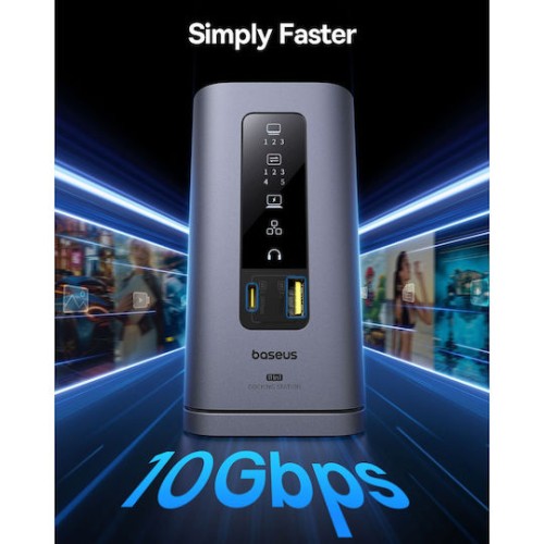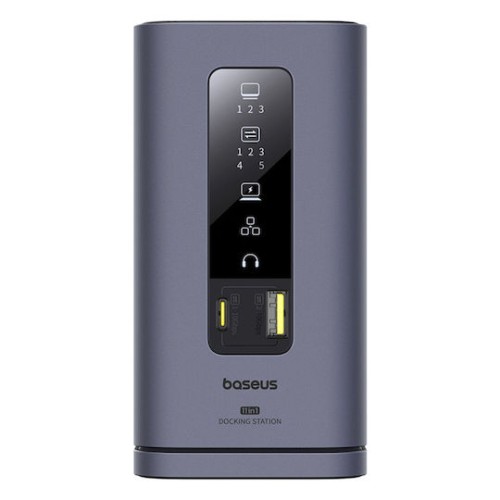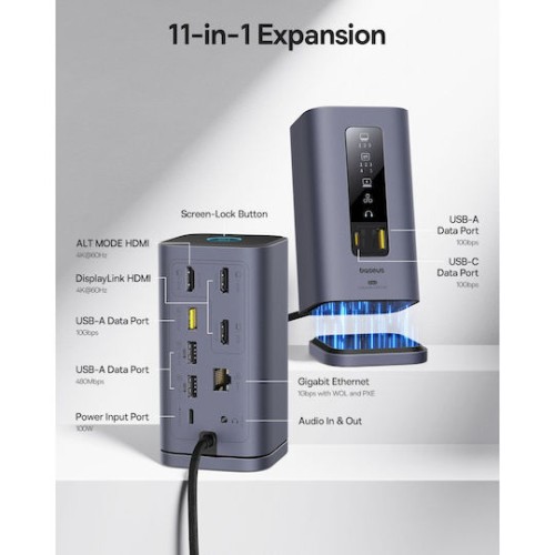 Το Baseus Spacemate Series 11-in-1 (MAC) είναι docking station με θύρα USB-C και δυνατότητα τριπλής επέκτασης οθόνης (μέσω 3 HDMI έως 4K@60Hz). Διαθέτει θύρες USB-A 3.2×2 και USB-C 3.2×1 (10 Gbps), USB-A 2.0×2 (480 Mbps), Ethernet 1 Gbps, audio 3.5 mm (96 kHz/24-bit) και PD φόρτιση έως 100 W. Υποστηρίζει Windows, macOS, Android και Chrome OS,