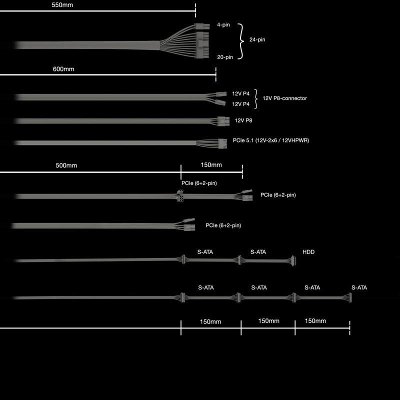 | Συνδέσεις Ισχύος | 1 x 24-pin ATX με αποσπώμενο 4-pin τμήμα, 1 x 8-pin +12V με αποσπώμενο 4-pin τμήμα, 1 x 8-pin +12V, 1 x 12VHPWR, 3 x 8-pin PCI Express με αποσπώμενο 2-pin τμήμα, 6 x 15-pin Serial ATA, 1 x 4-pin εσωτερική τροφοδοσία |