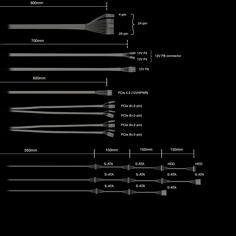 | Έξοδοι Τροφοδοσίας | 1 x 24 pin ATX με αποσπώμενο 4 pin τμήμα, 1 x 8 pin +12V με αποσπώμενο 4 pin τμήμα, 1 x 8 pin EPS12V, 1 x 12VHPWR, 4 x 8 pin PCI Express με αποσπώμενο 2 pin τμήμα, 9 x 15 pin Serial ATA, 2 x Parallel ATA |