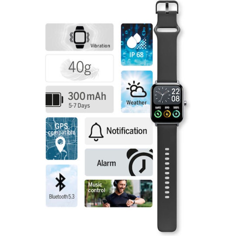 Τα προϊόντα που δεν αναγράφουν διαθέσιμο σημαίνει ότι δεν υπάρχουν άμεσα διαθέσιμα στο κατάστημα και θα παραληφθούν το αργότερο εντός των εργάσιμων ημερών που αναγράφεται στη διαθεσιμότητα. Σε κάθε περίπτωση η ημερομηνία μπορεί να μεταβληθεί και θα υπάρχει σχετική ενημέρωσή σας.Το smartwatch διαθέτει οθόνη 1,8 ιντσών, προσφέροντας ευκρινή και ευανάγνωστη απεικόνιση. Είναι συμβατό με Android και iOS, επιτρέποντας τη σύνδεση με τα περισσότερα smartphones. Η χρήση Bluetooth εξασφαλίζει εύκολη και γρήγορη σύνδεση με το κινητό. Η κατασκευή του περιλαμβάνει λουράκι από σιλικόνη, που προσφέρει άνεση και ανθεκτικότητα. Επιπλέον, υποστηρίζει λειτουργίες όπως ειδοποιήσεις email, SMS, υπενθυμίσεις κλήσεων και ειδοποιήσεις από εφαρμογές κοινωνικών δικτύων. Είναι ιδανικό για χρήση σε αθλήματα και γυμναστήριο, ενώ διαθέτει πιστοποίηση αντοχής MIL-STD-810.