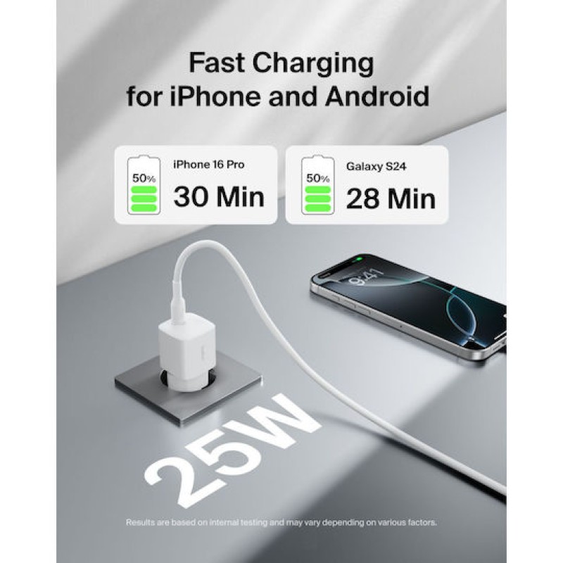Διαθέτει μία θύρα USB-C, υποστηρίζοντας γρήγορη φόρτιση μέσω της τεχνολογίας Power Delivery. Αυτή η τεχνολογία προσαρμόζει αυτόματα την τάση και την ισχύ που απαιτεί η συσκευή σου, εξασφαλίζοντας έτσι ασφαλή και βέλτιστη φόρτιση, καθώς και προστασία από την υπερφόρτιση ή την υπερθέρμανση. Με αυτό το φορτιστή, μπορείς να φτάσεις το 50% φόρτιση σε μόλις 30 λεπτά για smartphones που υποστηρίζουν γρήγορη φόρτιση.