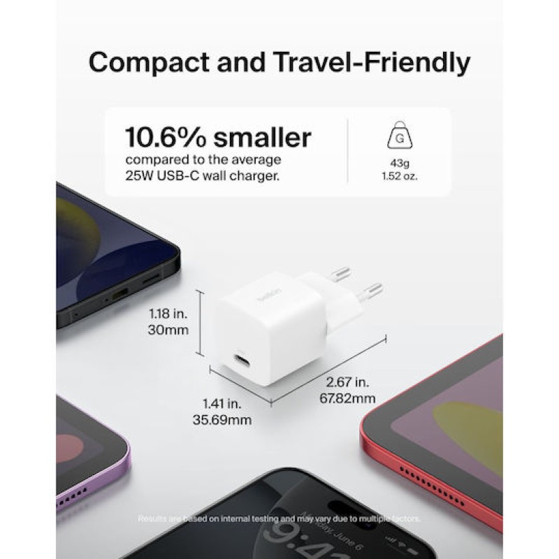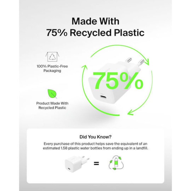 Διαθέτει μία θύρα USB-C, υποστηρίζοντας γρήγορη φόρτιση μέσω της τεχνολογίας Power Delivery. Αυτή η τεχνολογία προσαρμόζει αυτόματα την τάση και την ισχύ που απαιτεί η συσκευή σου, εξασφαλίζοντας έτσι ασφαλή και βέλτιστη φόρτιση, καθώς και προστασία από την υπερφόρτιση ή την υπερθέρμανση. Με αυτό το φορτιστή, μπορείς να φτάσεις το 50% φόρτιση σε μόλις 30 λεπτά για smartphones που υποστηρίζουν γρήγορη φόρτιση.