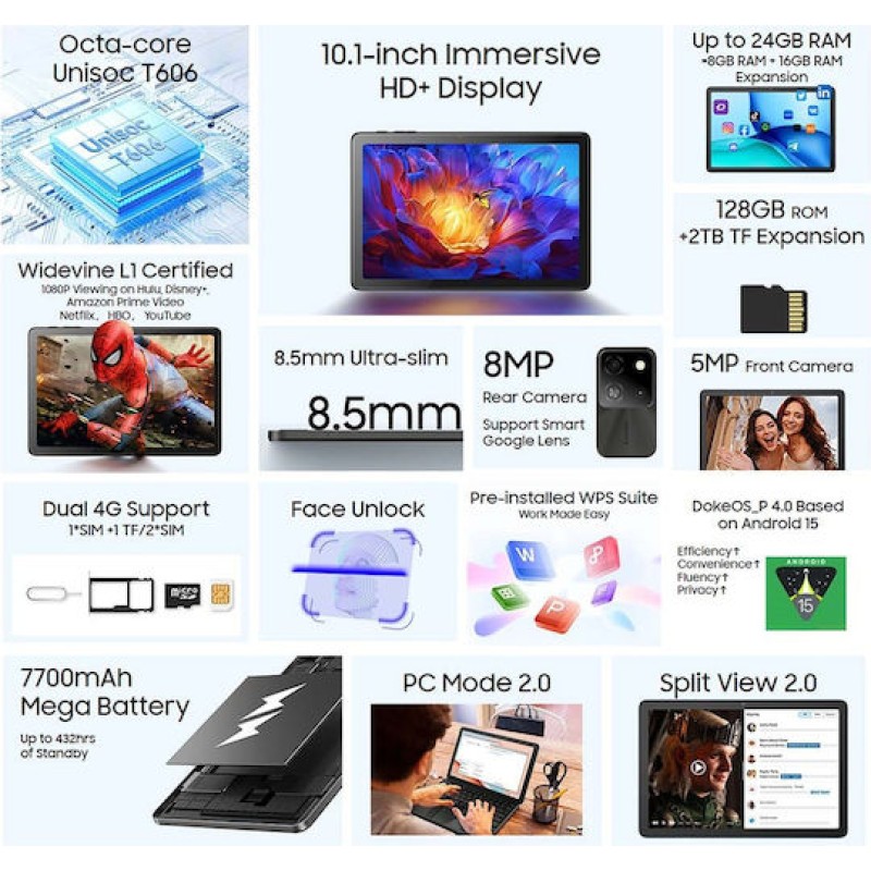Τα προϊόντα που δεν αναγράφουν διαθέσιμο σημαίνει ότι δεν υπάρχουν άμεσα διαθέσιμα στο κατάστημα και θα παραληφθούν το αργότερο εντός των εργάσιμων ημερών που αναγράφεται στη διαθεσιμότητα. Σε κάθε περίπτωση η ημερομηνία μπορεί να μεταβληθεί και θα υπάρχει σχετική ενημέρωσή σας.Το tablet διαθέτει λειτουργικό σύστημα Android και κυκλοφορεί το 2024. Έχει μαύρο χρώμα και βάρος 538 γραμμάρια, καθιστώντας το αρκετά ελαφρύ και άνετο στη χρήση. Εξοπλισμένο με επεξεργαστή Unisoc T606 και συνδυασμό πυρήνων 2+6, προσφέρει αποδοτική λειτουργία για καθημερινές εφαρμογές. Η βασική συχνότητα του επεξεργαστή είναι 1,6 GHz, ενώ η μνήμη RAM είναι 8 GB, εξασφαλίζοντας ομαλή λειτουργία και multitasking. Ο αποθηκευτικός χώρος είναι 128 GB, με δυνατότητα επέκτασης μέσω κάρτας μνήμης.