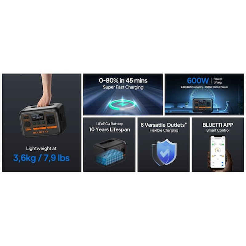 | Έξοδοι (Output) | – AC: 300 W ονομαστική ισχύς – Ισχύς αιχμής (surge) / Power Lifting Mode: 600 W – USB‑C: 1 θύρα, έως 100 W – USB‑A: 2 × 5 V / 2,4 A (κάθε θύρα) – Έξοδος 12V DC (αναπτήρας / regulated): 1 × 12 V / 10 A |