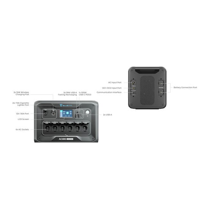 | Συνολική μέγιστη ισχύς εισόδου (AC + Solar) | ~5.400 W (π.χ. 3.000 W AC + 2.400 W Solar) — απαιτούνται τουλάχιστον 2 μονάδες B300 για να επιτευχθεί αυτός ο συνδυασμός. |