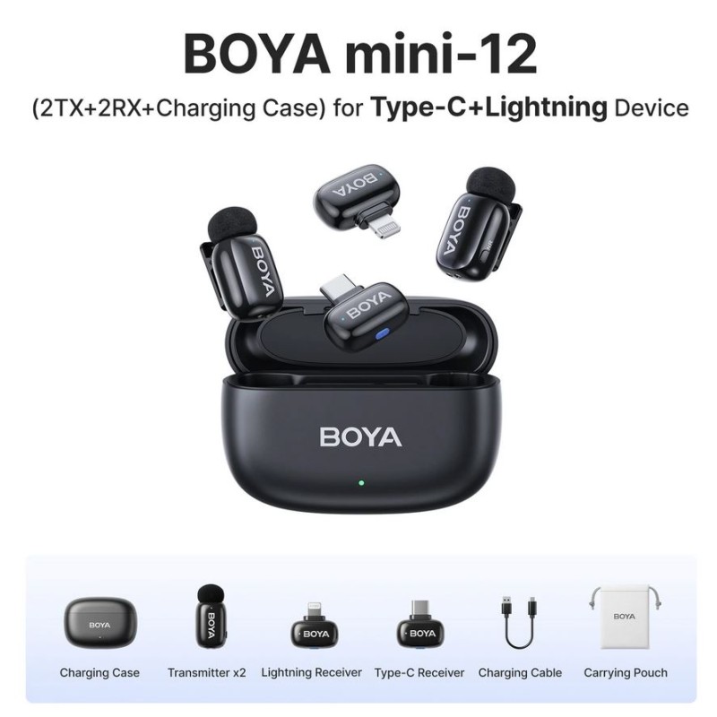 Το BOYA Mini-12 είναι ένα εξαιρετικά μικρό και ελαφρύ ασύρματο σύστημα μικροφώνου, σχεδιασμένο για συσκευές με θύρα USB-C αλλά και Lightning καθότι διαθέτει δύο δέκτες. Με βάρος μόλις 5 γραμμάρια, προσφέρει ευκολία στη χρήση και φορητότητα, καθιστώντας το ιδανικό για δημιουργούς περιεχομένου, vloggers και δημοσιογράφους εν κινήσει. Το σύστημα λειτουργεί στη συχνότητα των 2,4 GHz, εξασφαλίζοντας σταθερή και καθαρή μετάδοση ήχου. Διαθέτει τρία επίπεδα μείωσης θορύβου, επιτρέποντας την προσαρμογή σε διάφορα περιβάλλοντα ηχογράφησης. Επιπλέον, προσφέρει τρεις λειτουργίες αλλαγής φωνής, προσθέτοντας ευελιξία και δημιουργικότητα στις ηχογραφήσεις σας. Η ενσωματωμένη μπαταρία του μικροφώνου παρέχει έως και 6 ώρες συνεχούς λειτουργίας, ενώ με τη χρήση της θήκης φόρτισης, η συνολική διάρκεια μπορεί να φτάσει τις 30 ώρες, εξασφαλίζοντας μακροχρόνια χρήση χωρίς διακοπές. Το BOYA Mini-12 είναι συμβατό με διάφορες συσκευές που διαθέτουν θύρα USB-C και Lightning, καθιστώντας το μια ευέλικτη επιλογή για ηχογραφήσεις υψηλής ποιότητας σε ποικίλες εφαρμογές.