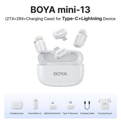 Το BOYA Mini-13 είναι ένα εξαιρετικά μικρό και ελαφρύ ασύρματο σύστημα μικροφώνου, σχεδιασμένο για συσκευές με θύρα USB-C αλλά και Lightning καθότι διαθέτει δύο δέκτες. Με βάρος μόλις 5 γραμμάρια, προσφέρει ευκολία στη χρήση και φορητότητα, καθιστώντας το ιδανικό για δημιουργούς περιεχομένου, vloggers και δημοσιογράφους εν κινήσει. Το σύστημα λειτουργεί στη συχνότητα των 2,4 GHz, εξασφαλίζοντας σταθερή και καθαρή μετάδοση ήχου. Διαθέτει τρία επίπεδα μείωσης θορύβου, επιτρέποντας την προσαρμογή σε διάφορα περιβάλλοντα ηχογράφησης. Επιπλέον, προσφέρει τρεις λειτουργίες αλλαγής φωνής, προσθέτοντας ευελιξία και δημιουργικότητα στις ηχογραφήσεις σας. Η ενσωματωμένη μπαταρία του μικροφώνου παρέχει έως και 6 ώρες συνεχούς λειτουργίας, ενώ με τη χρήση της θήκης φόρτισης, η συνολική διάρκεια μπορεί να φτάσει τις 30 ώρες, εξασφαλίζοντας μακροχρόνια χρήση χωρίς διακοπές. Το BOYA Mini-13 είναι συμβατό με διάφορες συσκευές που διαθέτουν θύρα USB-C και Lightning, καθιστώντας το μια ευέλικτη επιλογή για ηχογραφήσεις υψηλής ποιότητας σε ποικίλες εφαρμογές.