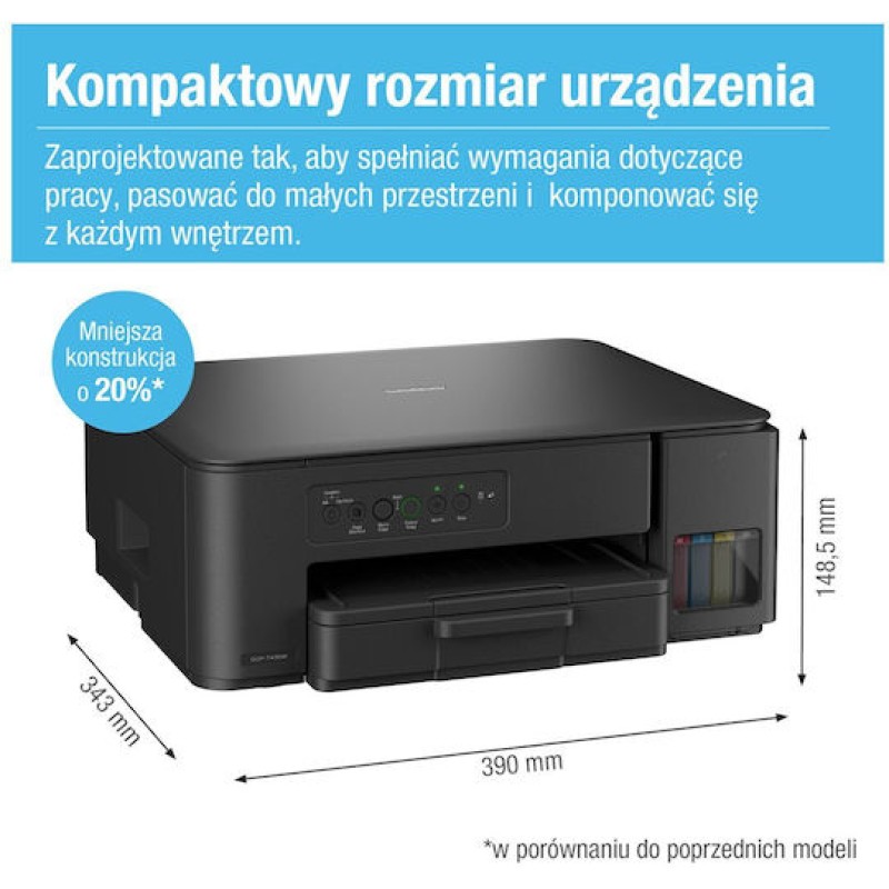Ο εκτυπωτής Brother DCP-T430W είναι ένα compact πολυμηχάνημα 3-σε-1 (εκτύπωση, σάρωση, αντιγραφή) με ασύρματη συνδεσιμότητα, σχεδιασμένος για οικονομική και εύκολη χρήση στο σπίτι ή το γραφείο. Διαθέτει σύστημα δοχείων μελανιού υψηλής απόδοσης που μειώνει το κόστος ανά σελίδα και γεμίζει εύκολα χωρίς διαρροές, ενώ υποστηρίζει εκτύπωση έως 16 εικόνες/λεπτό. Προσφέρει σύνδεση μέσω WiFi 5GHz και USB, δυνατότητα εκτύπωσης και σάρωσης από κινητό μέσω της εφαρμογής Brother Mobile Connect, καθώς και δίσκο χαρτιού 150 φύλλων. Παράλληλα, ενσωματώνει προηγμένα χαρακτηριστικά ασφάλειας πολλαπλών επιπέδων για προστασία δεδομένων, συνδυάζοντας ευκολία, αποδοτικότητα και αξιόπιστη καθημερινή λειτουργία.