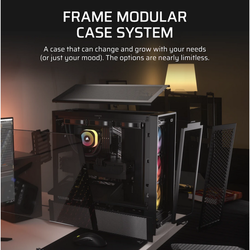 Το CORSAIR FRAME 4000D RS ARGB είναι μια πλήρως modular και ευρύχωρη θήκη PC που διαθέτει σύστημα τοποθέτησης ανεμιστήρων InfiniRail και είναι συμβατή με μητρικές πλακέτες με ανάστροφο σύνδεσμο.