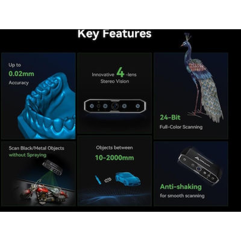 Ο 3D σαρωτής CR-Scan Otter προσφέρει αξιοσημείωτη ακρίβεια, φτάνοντας τα 0.02 mm σε απόσταση 60 mm από το αντικείμενο. Χάρη στον προηγμένο αλγόριθμο στερεοσάρωσης και την τεχνολογία δομημένου υπέρυθρου φωτός, η συσκευή αναπαράγει τις αυθεντικές δομές και περιγράμματα των αντικειμένων, καθιστώντας κάθε λεπτομέρεια σαφή και ακριβή.