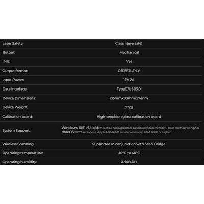 Ο CR-Scan Raptor προσφέρει ευρεία γκάμα χαρακτηριστικών και προδιαγραφών που επιτρέπουν την πολυμορφία στη χρήση του. Το εύρος εργασίας του σαρωτή είναι 150 έως 1,000 mm και ο ελάχιστος όγκος σάρωσης είναι 5 x 5 x 5 mm. Είναι ελαφρύς (372 g) και συμπαγής, διευκολύνοντας τη μεταφορά και τη χρήση του σε διάφορες τοποθεσίες.