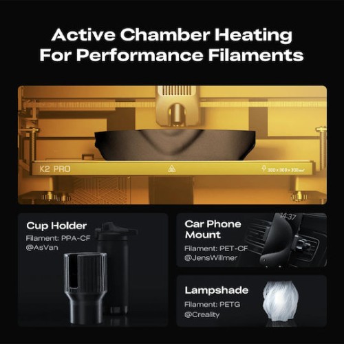 Η Creality K2 Pro είναι ένας επαγγελματικός τύπος FDM 3D εκτυπωτή με όγκο εκτύπωσης 300 × 300 × 300 mm, ταχύτητα έως 600 mm/s και επιτάχυνση έως 20 000 mm/s². Ενσωματώνει δύο AI κάμερες για παρακολούθηση της εκτύπωσης, αυτόματη εξισορρόπηση (auto-leveling), θαλάμο με ενεργή θέρμανση έως 60 °C για χρήση τεχνικών νημάτων (Όπως ABS, PA-CF), καθώς και δυνατότητα πολλαπλών νήματων/χρωμάτων μέσω του συστήματος CFS (έως 16 χρώματα). Κατασκευάζεται με στιβαρό πλαίσιο από κράμα αλουμινίου αεροδιαστημικής ποιότητας και είναι ιδανικός για απαιτητικές εφαρμογές όπου η ταχύτητα, η ακρίβεια και η πολυπλοκότητα έχουν σημασία. Περιλαμβάνει ένα Multicolor CFS.