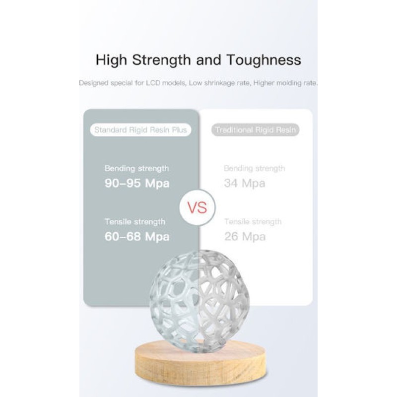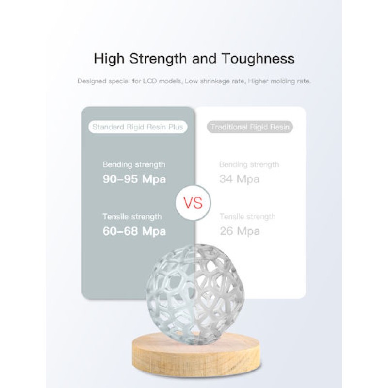 Συγκριτικά με τις παραδοσιακές σκληρές ρητίνες, η Standard Rigid Resin Plus είναι πιο ανθεκτική, με αύξηση 2,72 φορές στην αντοχή στην κάμψη3. Μπορεί να χρησιμοποιηθεί για τη δημιουργία δικών σας διακοσμητικών, αρχιτεκτονικών μοντέλων και πολλών άλλων εφαρμογών