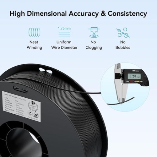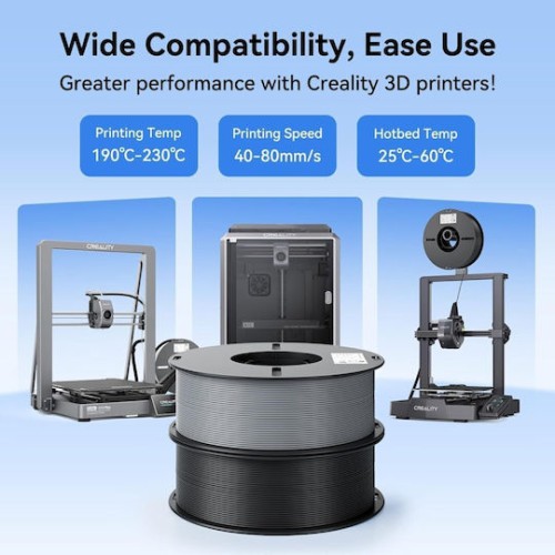 Νήμα PLA για 3D εκτυπωτή από την Creality3D σε μαύρο χρώμα. Το PLA παράγεται από ανανεώσιμες πηγές όπως ζαχαρότευτλα και καλαμπόκι και είναι βιοδιασπώμενο. Είναι αρκετά δημοφιλές, καθώς είναι εύκολο στη χρήση του, γρήγορο στην εκτύπωση με πολύ καλή πρόσφυση σε κρύα πλατφόρμα. Μπορεί να υποστεί επεξεργασία κι έχει γυαλιστερή επιφάνεια. Είναι σκληρό αλλά πιο εύθραυστο από το ABS.
