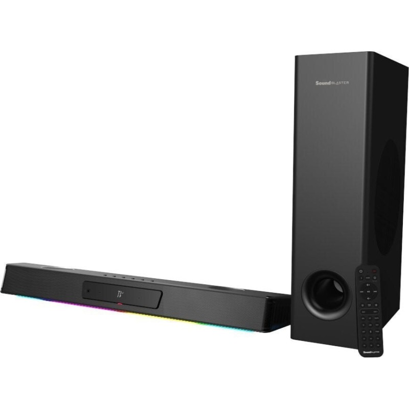 Soundbar Katana V2X της εταιρείας Creative. Ανήκει στην κατηγορία των 5.1 soundbars, δηλαδή διαθέτει 5 κανάλια υπεύθυνα για την απόδοση των ψηλών και μεσαίων ηχητικών συχνοτήτων στον χώρο και 1 κανάλι ή ξεχωριστό ηχείο (woofer) για τις χαμηλές. Στην προκειμένη περίπτωση, διαθέτει subwoofer το οποίο μπορεί να συνδεθεί ασύρματα, άρα μπορείτε να το τοποθετήσετε οπουδήποτε στον χώρο σας χωρίς να σας προβληματίζουν τα καλώδια.