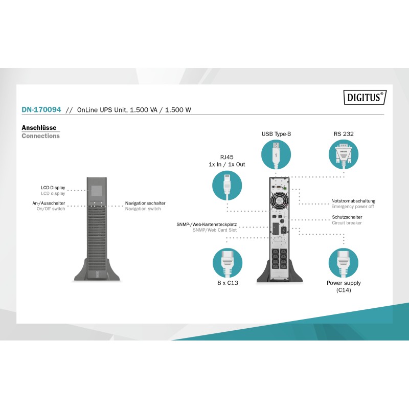Τα προϊόντα που δεν αναγράφουν διαθέσιμο σημαίνει ότι δεν υπάρχουν άμεσα διαθέσιμα στο κατάστημα και θα παραληφθούν το αργότερο εντός των εργάσιμων ημερών που αναγράφεται στη διαθεσιμότητα. Σε κάθε περίπτωση η ημερομηνία μπορεί να μεταβληθεί και θα υπάρχει σχετική ενημέρωσή σας.Το OnLine UPS On-Line 1500VA 1500W της Digitus είναι ένα Tower UPS. Η λειτουργία του είναι (VFI) On-Line/Double Conversion που προσφέρει συνεχώς ρεύμα από την μπαταρία του προστατεύοντας από αυξομειώσεις της τάσης αλλά και διακοπές ρεύματος. Προσφέρει ρεύμα καθαρού ημιτόνου που είναι κατάλληλο για ευαίσθητες συσκευές (πχ ιατρικά μηχανήματα) και προτιμάται για συσκευές με τροφοδοτικά που έχουν active PFC προστασία (πχ υπολογιστές).