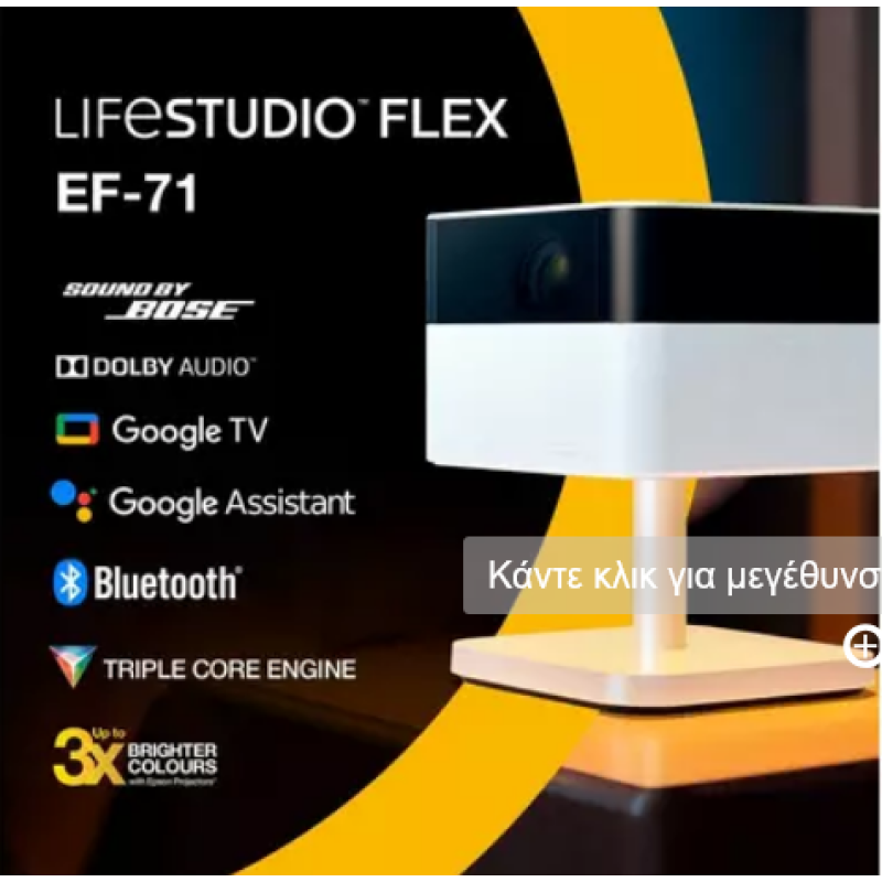 Το Epson Lifestudio Flex EF-71 Diamond White (V11HB79040) είναι ένας φορητός smart βιντεοπροβολέας Full HD που συνδυάζει κομψό σχεδιασμό με υψηλή πρακτικότητα, προσφέροντας φωτεινή και καθαρή εικόνα μέσω τεχνολογίας 3LCD και φωτεινότητας 700 ANSI lumen. Διαθέτει λέιζερ ως πηγή φωτός για μεγάλη διάρκεια ζωής, εξαιρετικά υψηλή αντίθεση και ρυθμιζόμενη βάση για εύκολη τοποθέτηση σε κάθε χώρο, ενώ ο ήχος Sound by Bose εξασφαλίζει εντυπωσιακή ακουστική απόδοση. Με ενσωματωμένο Google TV, Wi-Fi, Bluetooth και θύρα HDMI, παρέχει πλήρη πρόσβαση σε εφαρμογές και streaming υπηρεσίες, αποτελώντας ιδανική επιλογή για ψυχαγωγία στο σπίτι ή προβολές σε εσωτερικούς και εξωτερικούς χώρους.