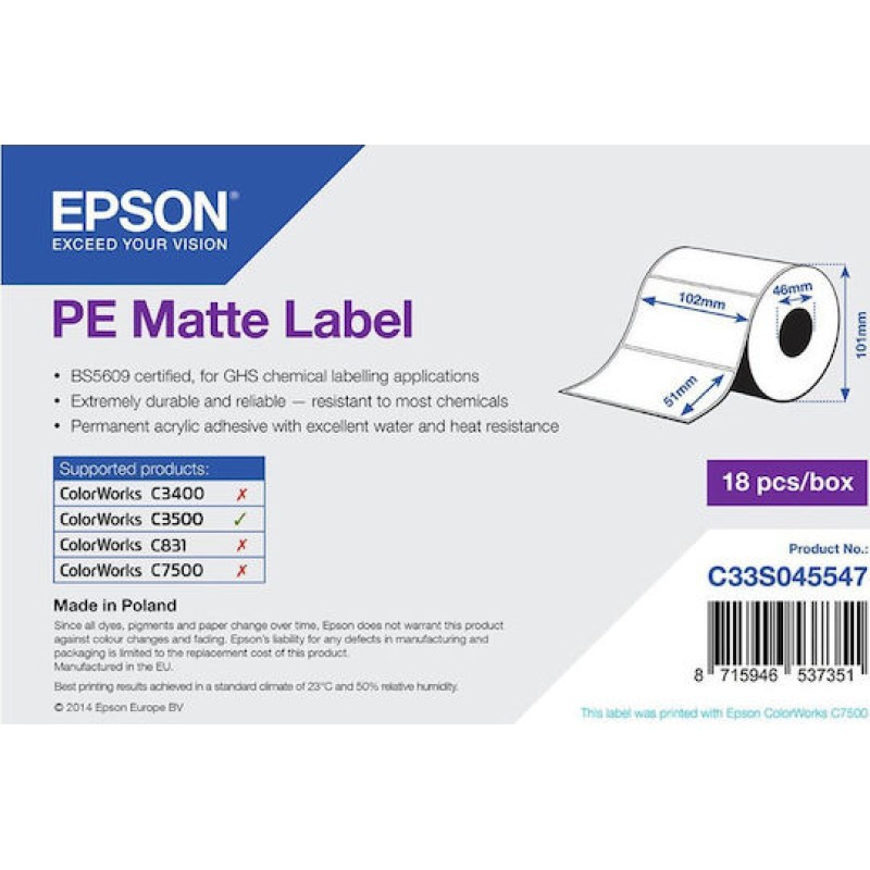 Epson PE Matte 535 Αυτοκόλλητες Ετικέτες σε Ρολό για Εκτυπωτή Ετικετών 102x51mm (7113410)
