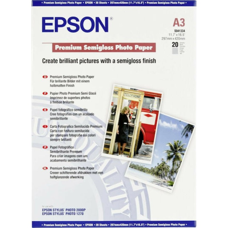 Epson Premium Semi Gloss Φωτογραφικό Χαρτί A3 251gr/m² για Εκτυπωτές Inkjet 20 Φύλλα (C13S041334)