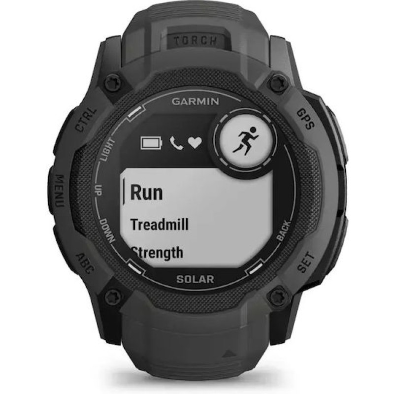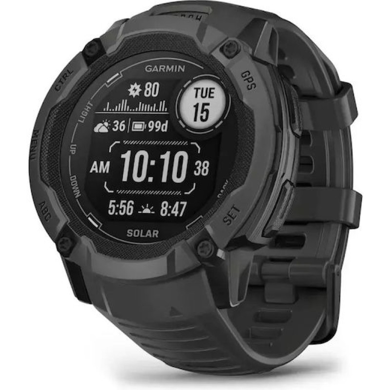 Το Garmin Instinct 2X Solar είναι ένα ανθεκτικό outdoor smartwatch με κάσα 50 mm, οθόνη MIP 1,1″ και ενσωματωμένο LED φακό. Υποστηρίζει ηλιακή φόρτιση με αυτονομία έως 40 ημέρες (απεριόριστη με ήλιο) και έως 60 ώρες GPS. Διαθέτει αισθητήρες καρδιακού ρυθμού, SpO₂, πυξίδα, βαρόμετρο και GNSS πολλαπλών συχνοτήτων. Είναι αδιάβροχο έως 10 ATM και σχεδιασμένο για σκληρή χρήση σε εξωτερικές συνθήκες.