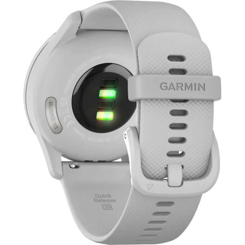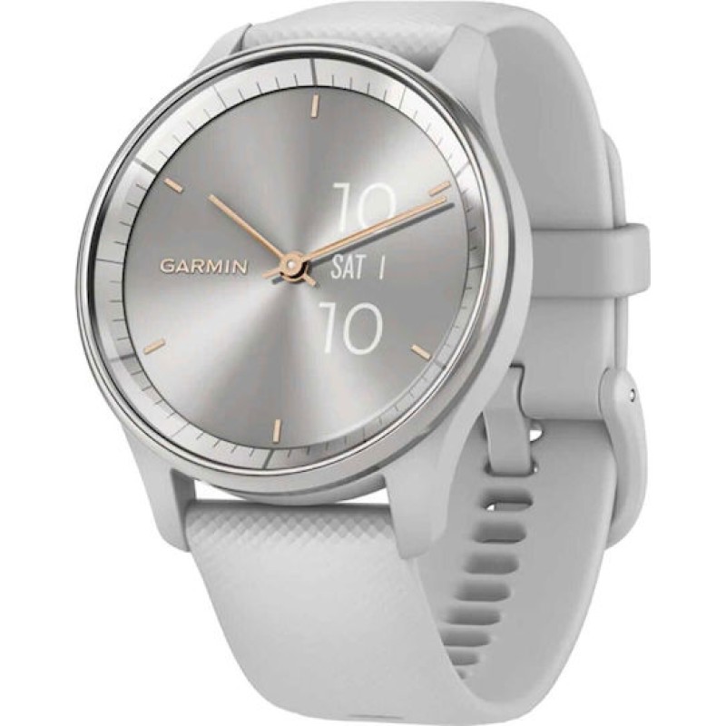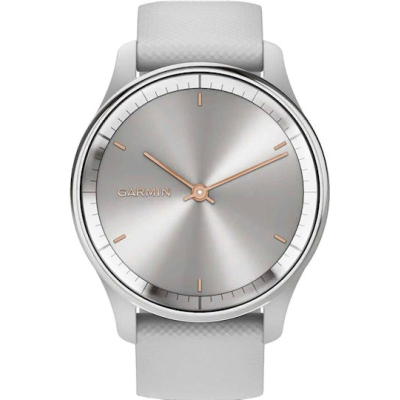 Το Garmin vívomove® Trend French Gray είναι ένα κομψό, υβριδικό smartwatch που συνδυάζει την κλασική αισθητική ενός αναλογικού ρολογιού με τις σύγχρονες έξυπνες λειτουργίες. Διαθέτει φυσικούς δείκτες και μια διακριτική, κρυμμένη οθόνη αφής, η οποία ενεργοποιείται όταν τη χρειάζεστε, ενώ οι δείκτες μετακινούνται έξυπνα ώστε να μην καλύπτουν τις πληροφορίες. Παρά την αναλογική του εμφάνιση, το vívomove Trend προσφέρει ειδοποιήσεις από το smartphone, ανέπαφες πληρωμές μέσω Garmin Pay, λειτουργίες παρακολούθησης υγείας όπως καταγραφή καρδιακών παλμών, παρακολούθηση ύπνου, επιπέδων στρες και ενέργειας (Body Battery). Υποστηρίζει επίσης λειτουργίες fitness, ενώ για GPS βασίζεται στο smartphone. Έχει αυτονομία έως και 5 ημέρες σε λειτουργία smartwatch και επιπλέον 1 ημέρα ως απλό αναλογικό ρολόι. Είναι ανθεκτικό στο νερό (5 ATM), κατάλληλο για ντους ή κολύμπι, και διαθέτει εναλλάξιμο λουράκι (20mm quick release).