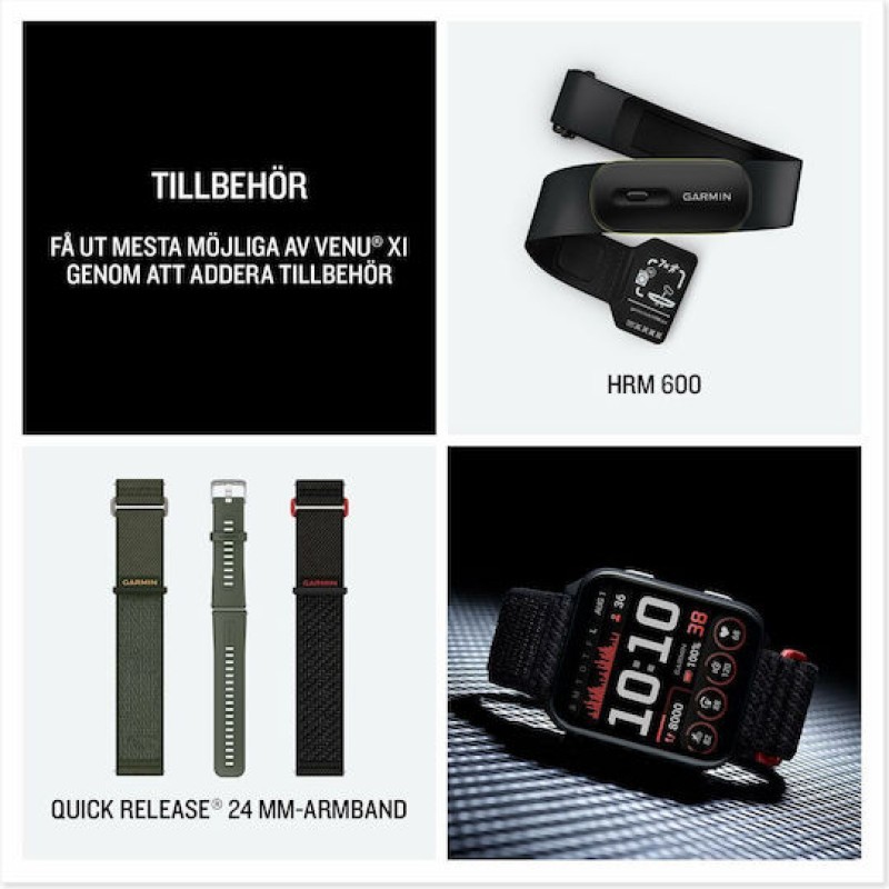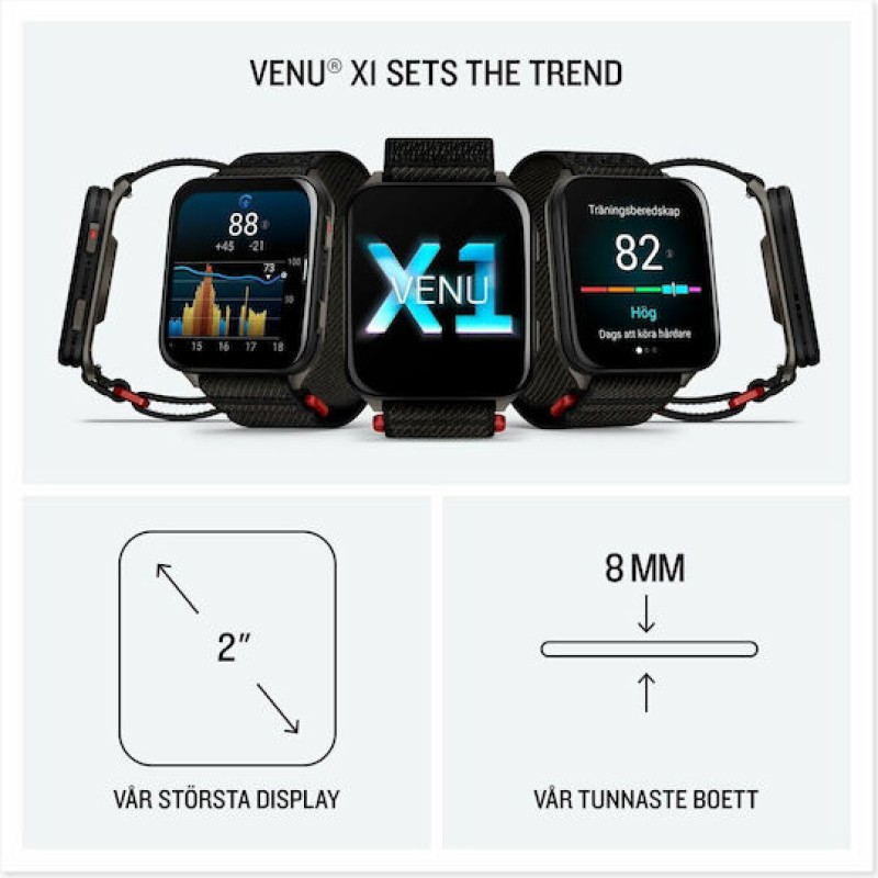 Το Garmin Venu X1 είναι ένα πολυτελές, λεπτό smartwatch με έμφαση στον σχεδιασμό και τη χρήση όλη τη μέρα. Διαθέτει οθόνη AMOLED 2″ υψηλής ανάλυσης (448 × 486 px). Η κάσα του έχει τιτάνιο πίσω μέρος και κρύσταλλο ζαφειριού, ενώ υποστηρίζει λειτουργίες όπως έγχρωμοι χάρτες, πάνω από 100 προφίλ αθλημάτων, ενσωματωμένο ηχείο και μικρόφωνο για κλήσεις, καθώς και φακό LED για χρήση σε χαμηλό φωτισμό. Παρακολουθεί πλήθος μετρήσεων υγείας και φυσικής κατάστασης, όπως παλμό, οξυγόνο αίματος, ύπνο και ενέργεια σώματος. Η μπαταρία του διαρκεί έως ~8 ημέρες σε κανονική χρήση, αλλά η διάρκεια γίνεται μικρότερη με λειτουργία συνεχούς οθόνης ή GPS.