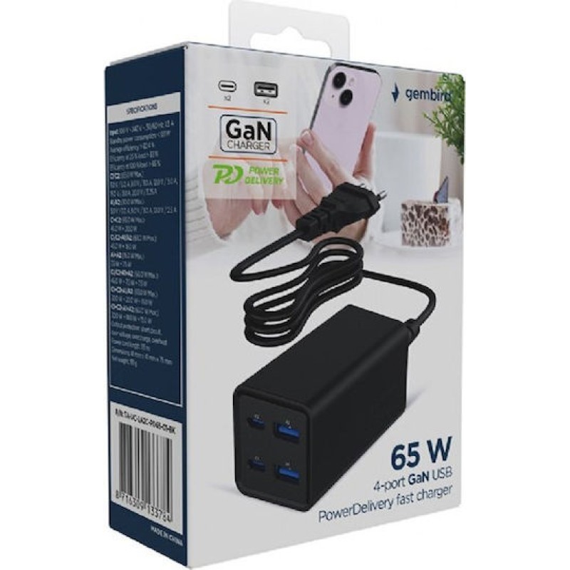 Gembird Βάση Φόρτισης GaN με 2 Θύρες USB-A και 2 Θύρες USB-C 65W Power Delivery / Quick Charge 3.0 σε Μαύρο χρώμα (TA-UC-2A2C-PD65-01-BK) (TA-UC-2A2C-PD65-01-BK)
