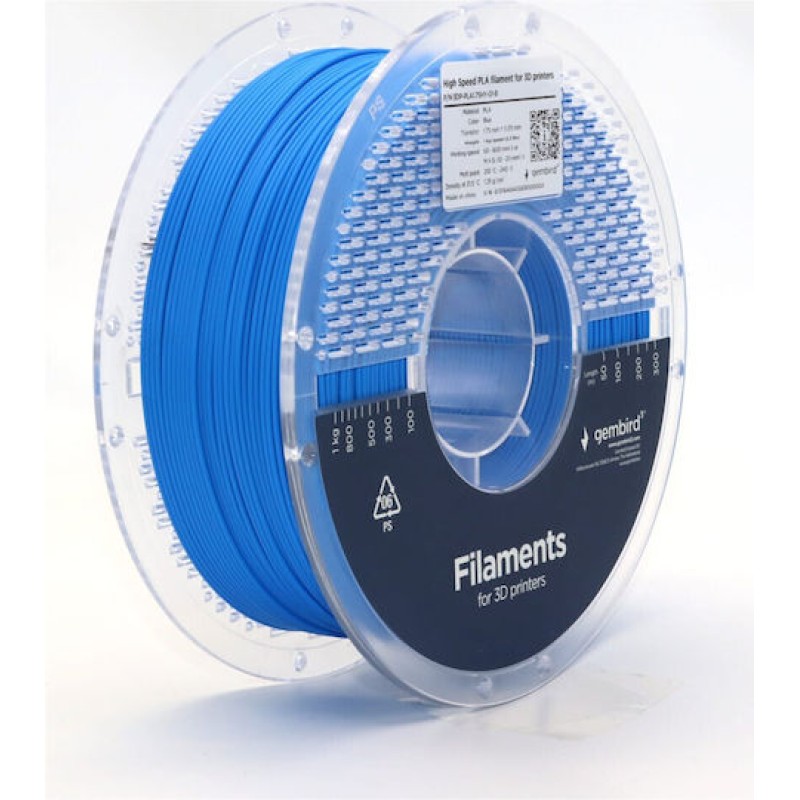 Νήμα PLA για 3D εκτυπωτή από την Gembird σε μπλε χρώμα. Το PLA παράγεται από ανανεώσιμες πηγές όπως ζαχαρότευτλα και καλαμπόκι και είναι βιοδιασπώμενο. Είναι αρκετά δημοφιλές, καθώς είναι εύκολο στη χρήση του, γρήγορο στην εκτύπωση με πολύ καλή πρόσφυση σε κρύα πλατφόρμα. Μπορεί να υποστεί επεξεργασία κι έχει γυαλιστερή επιφάνεια. Είναι σκληρό αλλά πιο εύθραυστο από το ABS.