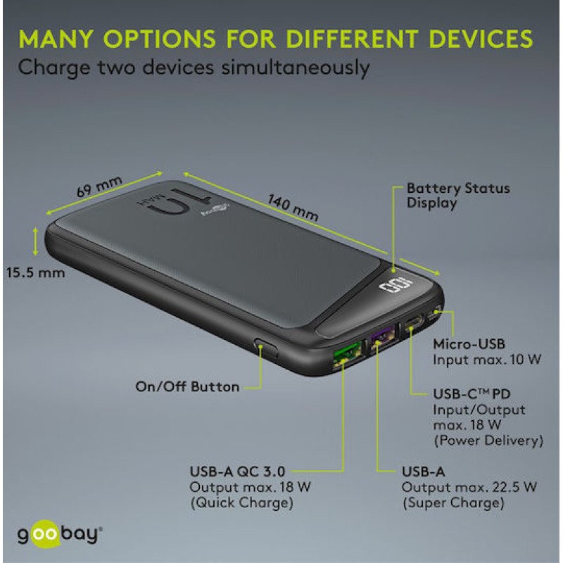 Τα προϊόντα που δεν αναγράφουν διαθέσιμο σημαίνει ότι δεν υπάρχουν άμεσα διαθέσιμα στο κατάστημα και θα παραληφθούν το αργότερο εντός των εργάσιμων ημερών που αναγράφεται στη διαθεσιμότητα. Σε κάθε περίπτωση η ημερομηνία μπορεί να μεταβληθεί και θα υπάρχει σχετική ενημέρωσή σας.Με το power bank GOOBAY 53936, η εξάντληση μπαταρίας δεν θα είναι πλέον πρόβλημα. Διαθέτει μεγάλη χωρητικότητα 10.000mAh, 2 θύρες εξόδου USB και 1 θύρα USB Type-C (PD) με συνολική απόδοση έως 22.5W.