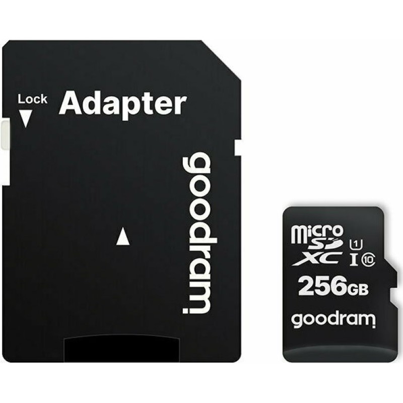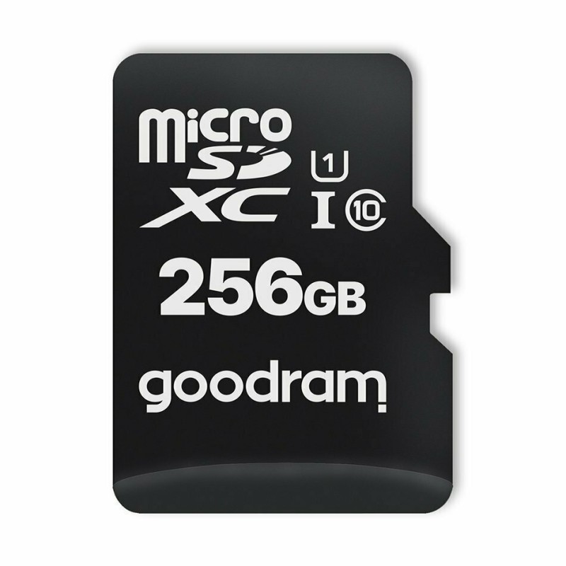 microSDXC κάρτα μνήμης της εταιρίας GoodRAM. Διαθέτει χωρητικότητα 256GB. Το μέγεθος αυτό είναι ικανό να υποστηρίξει μεγάλο όγκο φωτογραφιών, αρκετά παιχνίδια αν προορίζεται για κονσόλα, για πολύωρη καταγραφή σε action cams, drones κ.α.