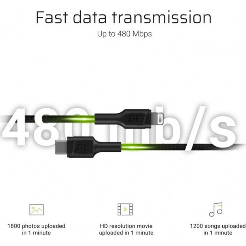 Lightning καλώδιο της εταιρίας Green Cell που συνδέει την Apple συσκευή με υποδοχή Lightning στη θύρα USB του υπολογιστή ή του φορτιστή για συγχρονισμό και φόρτιση.
