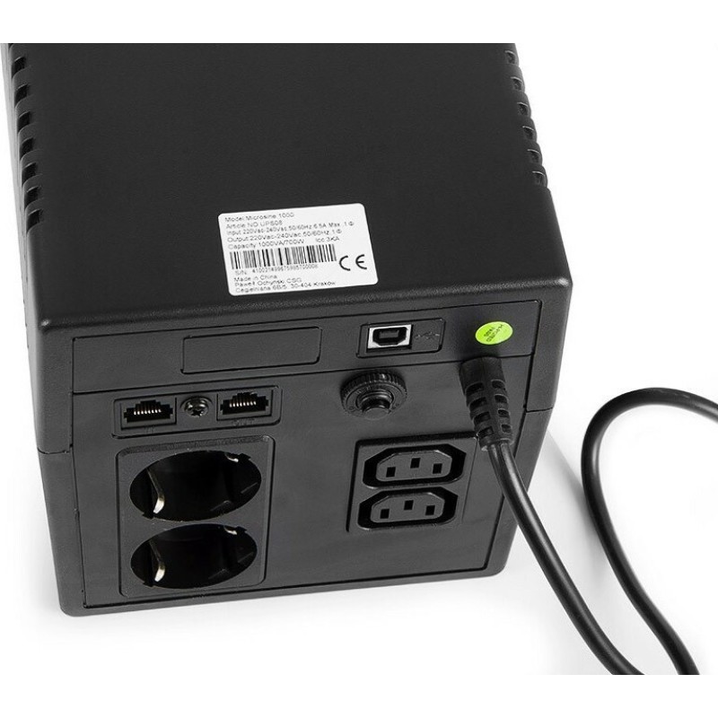 Το Microsine 1000VA UPS Line-Interactive 700W με 2 Schuko και 2 IEC Πρίζες της Green Cell είναι ένα Tower UPS. Διαθέτει 2 πρίζες τύπου Schuko,2 IEC εξόδους  καθώς και υποδοχή και έξοδο για καλώδιο ethernet και για καλώδιο τηλεφώνου, προστατεύοντας τις συσκευές που συνδέονται με αυτό π.χ. router ή τηλέφωνο (εφόσον είναι συνδεδεμένη και η τροφοδοσία τους σε UPS ή πολύπριζο ασφαλείας). Η λειτουργία του είναι (VI) Line-Interactive που προσαρμόζει την τάση εξόδου συνεχώς μέσω αυτόματου ρυθμιστή τάσης προστατεύοντας από αυξομειώσεις της τάσης και διακοπές του ρεύματος. Προσφέρει ρεύμα καθαρού ημιτόνου που είναι κατάλληλο για ευαίσθητες συσκευές (πχ ιατρικά μηχανήματα) και προτιμάται για συσκευές με τροφοδοτικά που έχουν active PFC προστασία (πχ υπολογιστές).