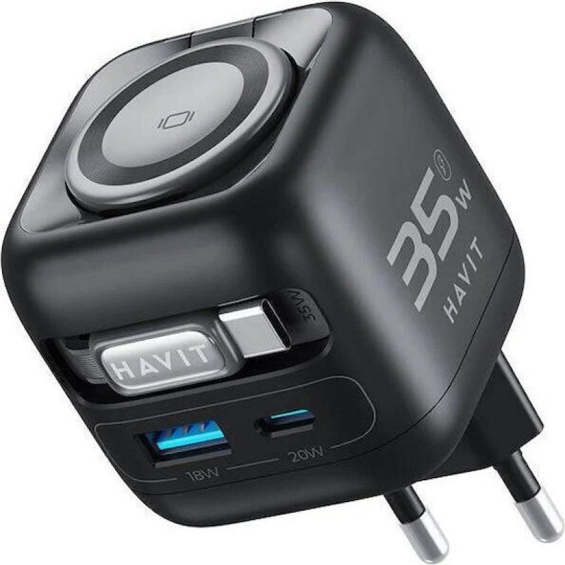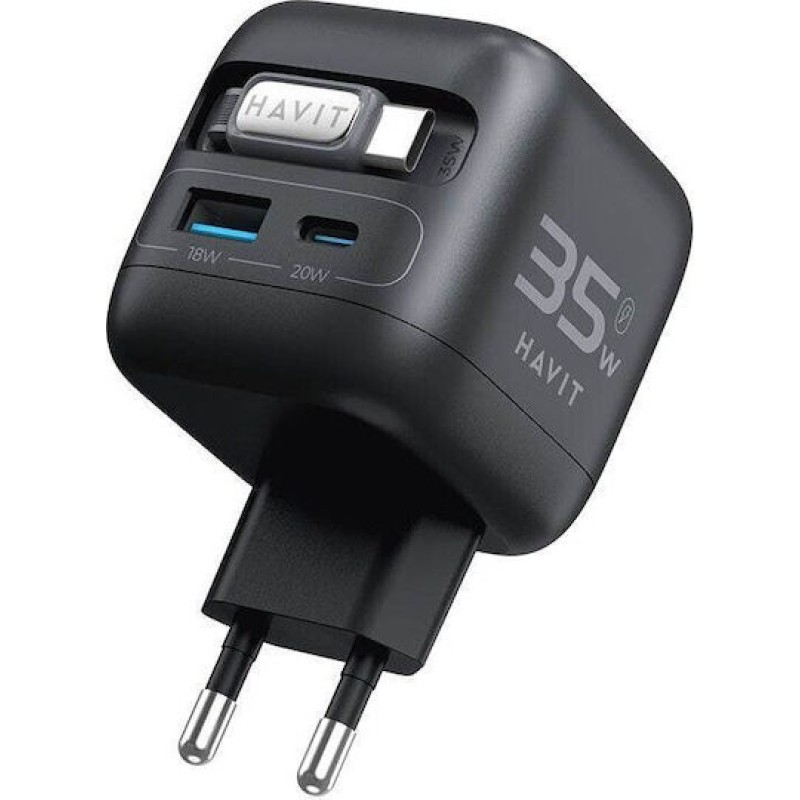 Havit Φορτιστής Χωρίς Καλώδιο GaN με Θύρα USB-A και Θύρα USB-C και Καλώδιο USB-C 35W Power Delivery Μαύρος (UC250) (UC250 A-EU)