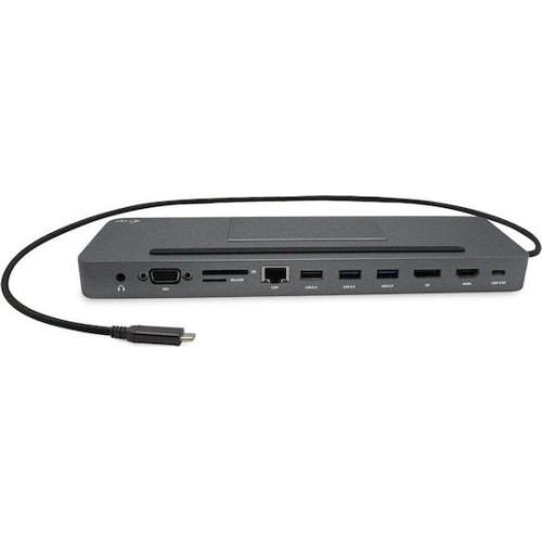 Η i-tec C31FLATPRO100-2 είναι εργονομική docking station σε μεταλλικό σώμα με ενσωματωμένο καλώδιο USB-C (60 cm), συμβατή με φορητούς υπολογιστές ή tablets που υποστηρίζουν USB-C ή Thunderbolt (με DisplayPort Alt Mode). Παρέχει έξοδο για τρεις οθόνες (1× DisplayPort, 1× HDMI, 1× VGA), 4 θύρες USB-A (2× USB 3.0 + 2× USB 2.0), υποδοχές για κάρτες SD και microSD, θύρα Gigabit Ethernet, καθώς και combo είσοδο/έξοδο ήχου 3,5 mm. Υποστηρίζει φόρτιση μέσω Power Delivery έως 85 W, ενώ στο πακέτο περιλαμβάνεται τροφοδοτικό USB-C 100 W.