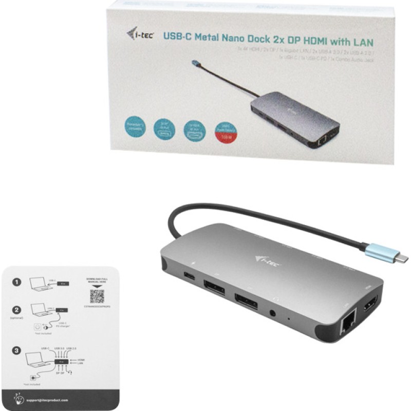 Docking Station της εταιρίας i-tec που συνδέεται σε Laptop με θύρα USB-C. Εξοπλίζεται με συνδέσεις για τις περιφερειακές συσκευές όπως 1 θύρα USB-C PD, 2 θύρες USB-A 2.0, 2 θύρες USB-A 3.1 και συνδέεται με οθόνη καθώς διαθέτει 1 θύρα HDMI 1.4, 2 θύρες DisplayPort 1.2. Ενσωματώνει θύρα Ethernet για την σύνδεση στο διαδίκτυο και audio Jack 3.5" για σύνδεση ακουστικών, ηχείων κ.α.
