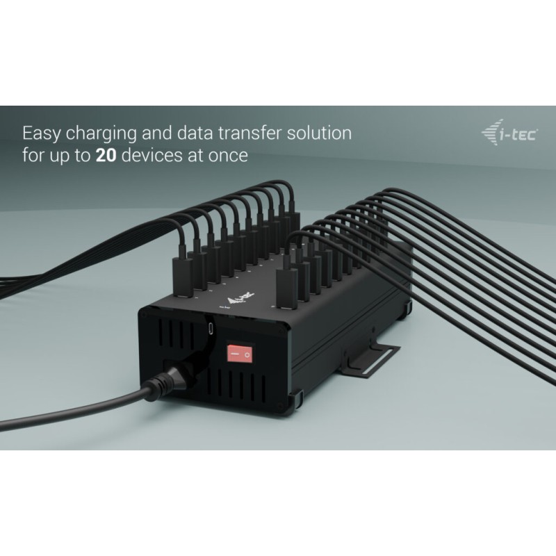 Το σύγχρονο HUB της i-tec διαθέτει 20 θύρες USB-C με λειτουργία Plug & Play και δυνατότητα φόρτισης έως 15W ανά θύρα. Μπορεί να φορτίσει έως και 20 συσκευές ταυτόχρονα, ενώ οι θύρες υποστηρίζουν και μεταφορά δεδομένων: δύο θύρες προσφέρουν ταχύτητα έως 5 Gbps (USB 3.2 Gen 1), ενώ οι υπόλοιπες 18 έως 480 Mbps (USB 2.0). Δεν απαιτείται εγκατάσταση οδηγών – απλά συνδέστε το στον υπολογιστή σας και είναι έτοιμο προς χρήση. Διαθέτει προστασία από υπερτάσεις και ρεύμα, ενώ μπορεί να χρησιμοποιηθεί αποκλειστικά για φόρτιση χωρίς σύνδεση σε υπολογιστή. Περιλαμβάνει ενσωματωμένο τροφοδοτικό 360 W και μεταλλικές βάσεις για σταθερή τοποθέτηση σε τραπέζι.