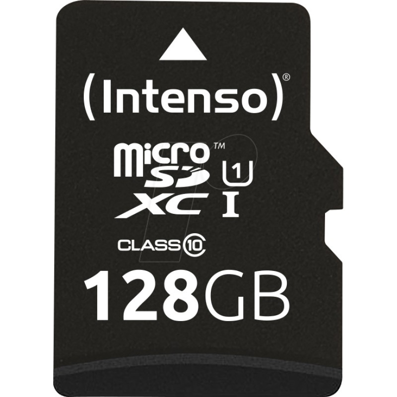 microSDXC κάρτα μνήμης της εταιρίας Intenso. Διαθέτει χωρητικότητα 128GB. Το μέγεθος αυτό είναι ικανό να υποστηρίξει μεγάλο όγκο φωτογραφιών, αρκετά παιχνίδια αν προορίζεται για κονσόλα, για πολύωρη καταγραφή σε action cams, drones κ.α.