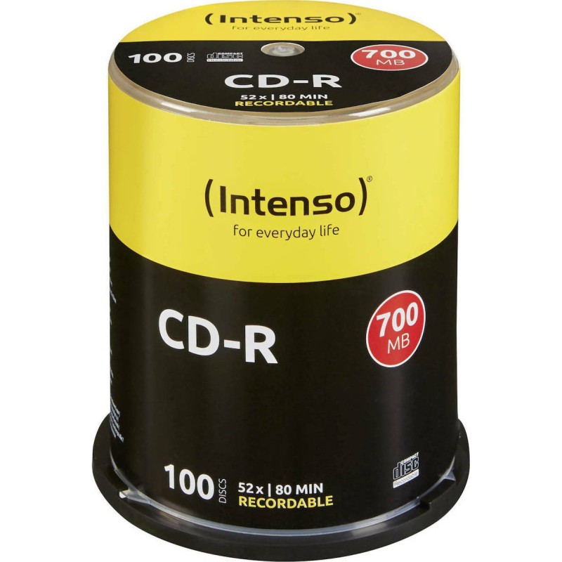 Εγγράψιμα CD σε συσκευασία 100 τεμαχίων της εταιρείας Intenso για την αποθήκευση δεδομένων, φωτογραφιών ή της μουσικής σας.