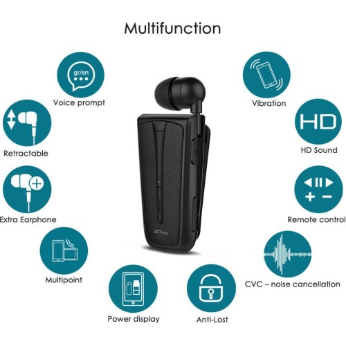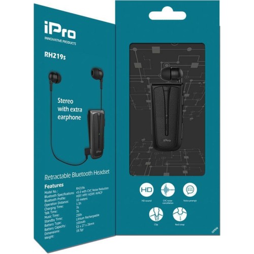 Το RH219s είναι ένα πρωτοποριακό προϊόν της iPro με δόνηση, καλώδιο περιέλιξης & αποσπώμενο 2ο ακουστικό! Έχει εξαιρετική ποιότητα ήχου, είναι ιδιαίτερα ελαφρύ μόλις 18,5gr & άνετο για καθημερινή χρήση. Διαθέτει τεχνολογία Multipoint που επιτρέπει την ταυτόχρονη σύνδεση και διαχείριση κλήσεων δύο συσκευών με το ακουστικό. Χάρη στη λειτουργία Power Display, σας δίνεται η δυνατότητα παρακολούθησης του επιπέδου μπαταρίας του Bluetooth από την οθόνη του κινητού σας! Διαθέτει ενσωματωμένα φωνητικά μηνύματα προτροπής σε Ελληνικά ή Αγγλικά που επιτρέπουν στον χρήστη να ενημερώνεται για την τρέχουσα κατάσταση του ακουστικού αλλά και τον αριθμό του καλούντος. Παράλληλα χάρη στη λειτουργία Anti-Lost, το iPro RH219s θα σας ειδοποιήσει μέσω δόνησης όταν η απόσταση μεταξύ της συσκευής που έχει γίνει σύζευξη επεκταθεί των 10m (προβλεπόμενο εύρος λειτουργίας). Προσφέρει πολλαπλές λύσεις μεταφοράς χρησιμοποιώντας είτε το κλιπ είτε το strap λαιμού που περιλαμβάνεται στην συσκευασία, ώστε να επιλέξετε τον βέλτιστο για εσάς τρόπο.*Η λειτουργία power display εξαρτάται από την έκδοση iOS & Android της συσκευής.