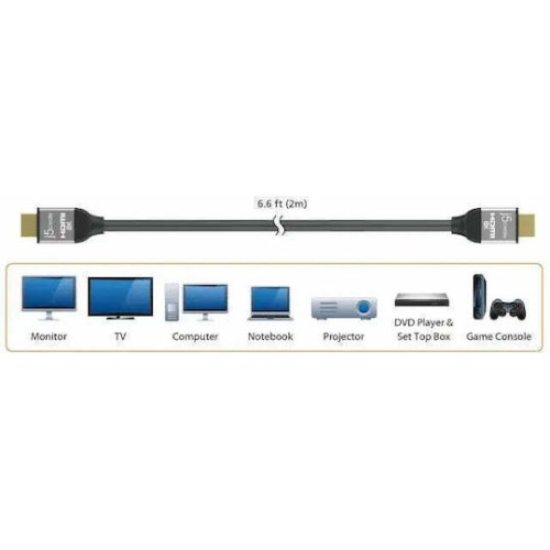 Καλώδιο J5 Create, μήκους 2m, με 2 ακροδέκτες HDMI male για σύνδεση συσκευών όπως υπολογιστές, projectors και κονσόλες με οθόνες και τηλεοράσεις.
