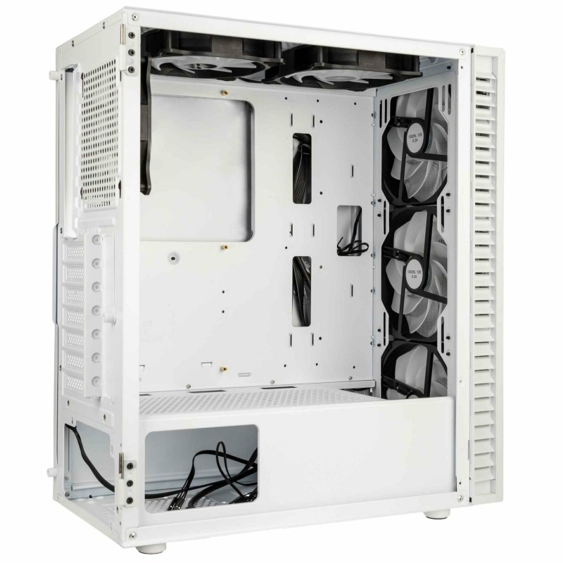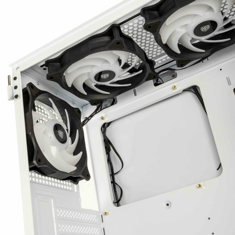 Το Midi Tower κουτί υπολογιστή σε λευκό χρώμα, κατασκευασμένο από ατσάλι και σκληρυμένο γυαλί, προσφέρει άριστη υποστήριξη για μητρικές πλακέτες ATX, micro ATX και Mini-ITX. Είναι ιδανικό για gaming, με δυνατότητα τοποθέτησης έως 7 καρτών επέκτασης και διαθέτει παράθυρο στο πλάι για να αναδεικνύει το εσωτερικό του. Διαθέτει RGB φωτισμό πολλαπλών χρωμάτων στα ανεμιστηράκια, με κουμπί ελέγχου RGB και καλωδιακή διαχείριση για καθαρή εμφάνιση. Υποστηρίζει υδρόψυξη με διάφορα μεγέθη ραδιοατόρων και έχει εργονομικά κουμπιά λειτουργίας και επαναφοράς.