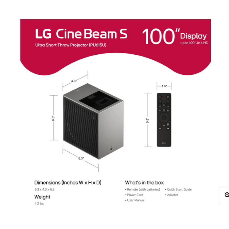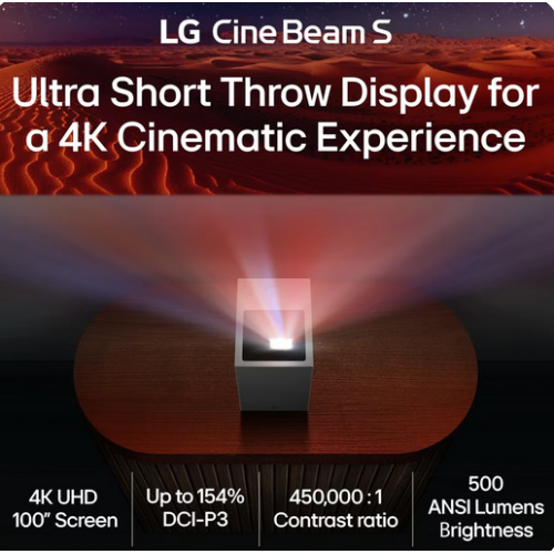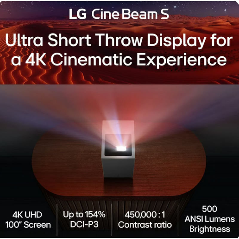 Τα προϊόντα που δεν αναγράφουν διαθέσιμο σημαίνει ότι δεν υπάρχουν άμεσα διαθέσιμα στο κατάστημα και θα παραληφθούν το αργότερο εντός των εργάσιμων ημερών που αναγράφεται στη διαθεσιμότητα. Σε κάθε περίπτωση η ημερομηνία μπορεί να μεταβληθεί και θα υπάρχει σχετική ενημέρωσή σας.Το LG CineBeam S PU615U είναι ένας φορητός προβολέας υπερ-βραχείας προβολής (UST) με ανάλυση 4K UHD (3840×2160) και τριπλή πηγή laser RGB που προσφέρει εξαιρετικά ζωντανά χρώματα. Με λόγο προβολής 0,25:1, μπορεί να δημιουργήσει εικόνα έως 100 ιντσών από απόσταση λίγων μόνο εκατοστών από τον τοίχο. Διαθέτει φωτεινότητα περίπου 500 ANSI lumens, αντίθεση 450.000:1, Dolby Atmos ήχο και το webOS της LG για εύκολη πρόσβαση σε εφαρμογές streaming.